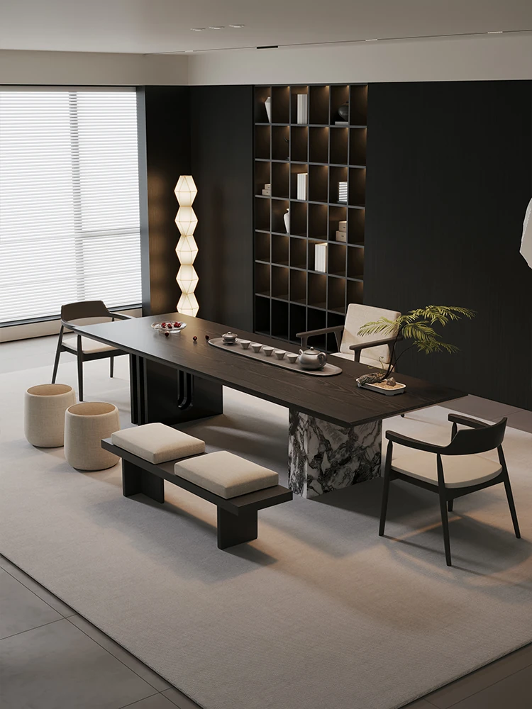 Luxurious Minimalist Rock Board Solid Wood Tea Table Set - 1 Table & 5 Chairs for Home Living Room - 2025 New High-End Modern Design