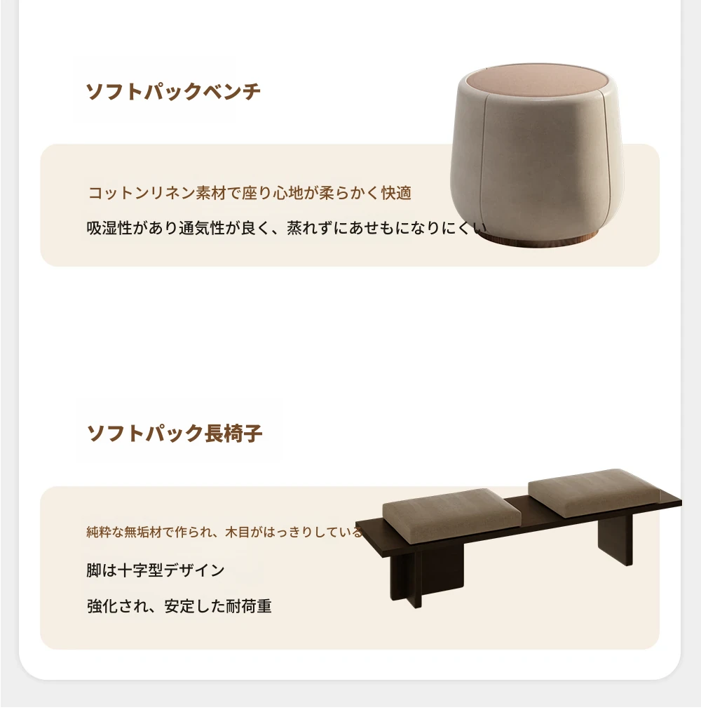 2.6メートル茶テーブル+ハイセイル椅子+ソフトパッキングスツール*2+1.2メートルベンチ