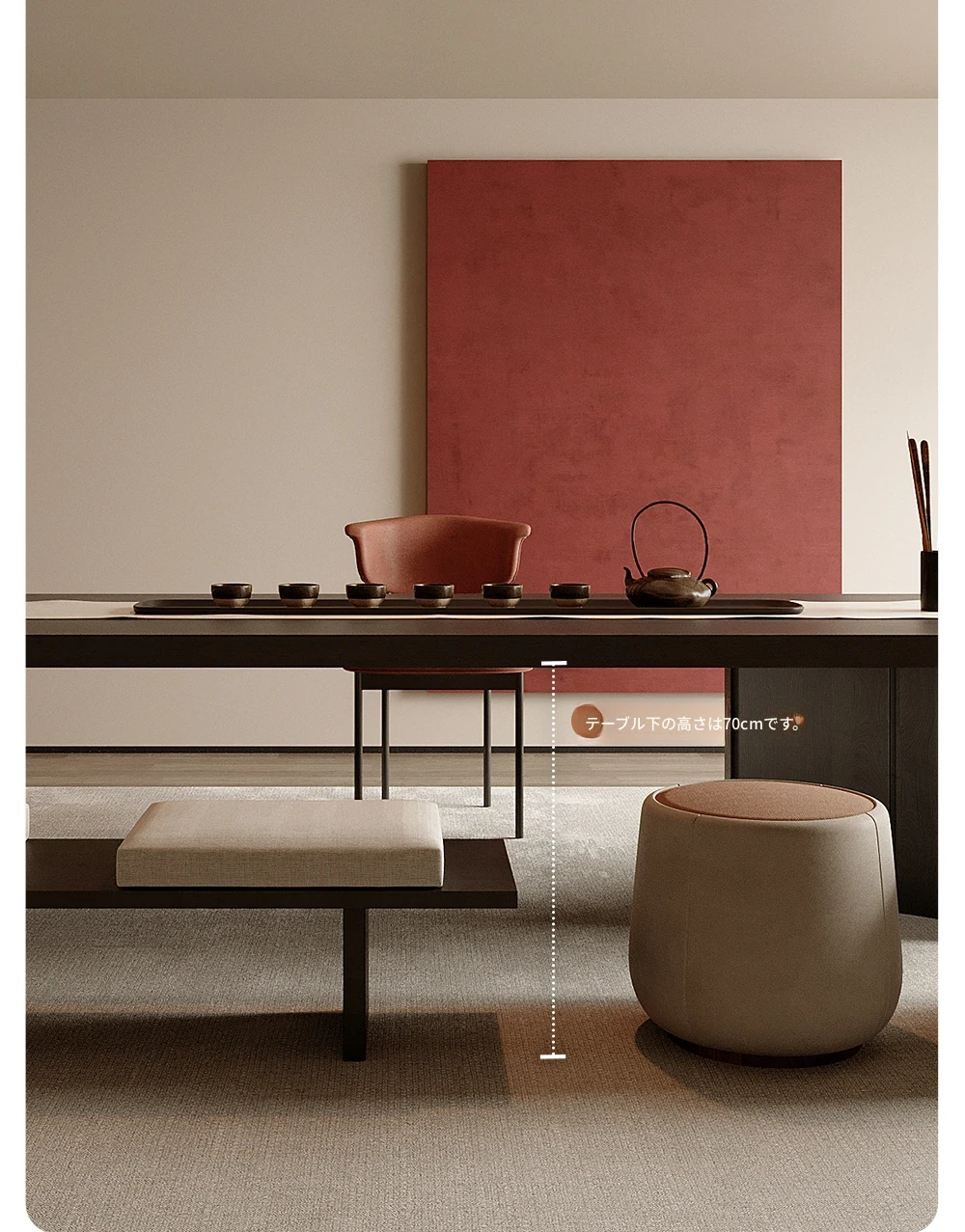 2.6メートル茶テーブル+ハイセイル椅子*3+ソフトパッキングスツール*2+1.2メートルベンチ