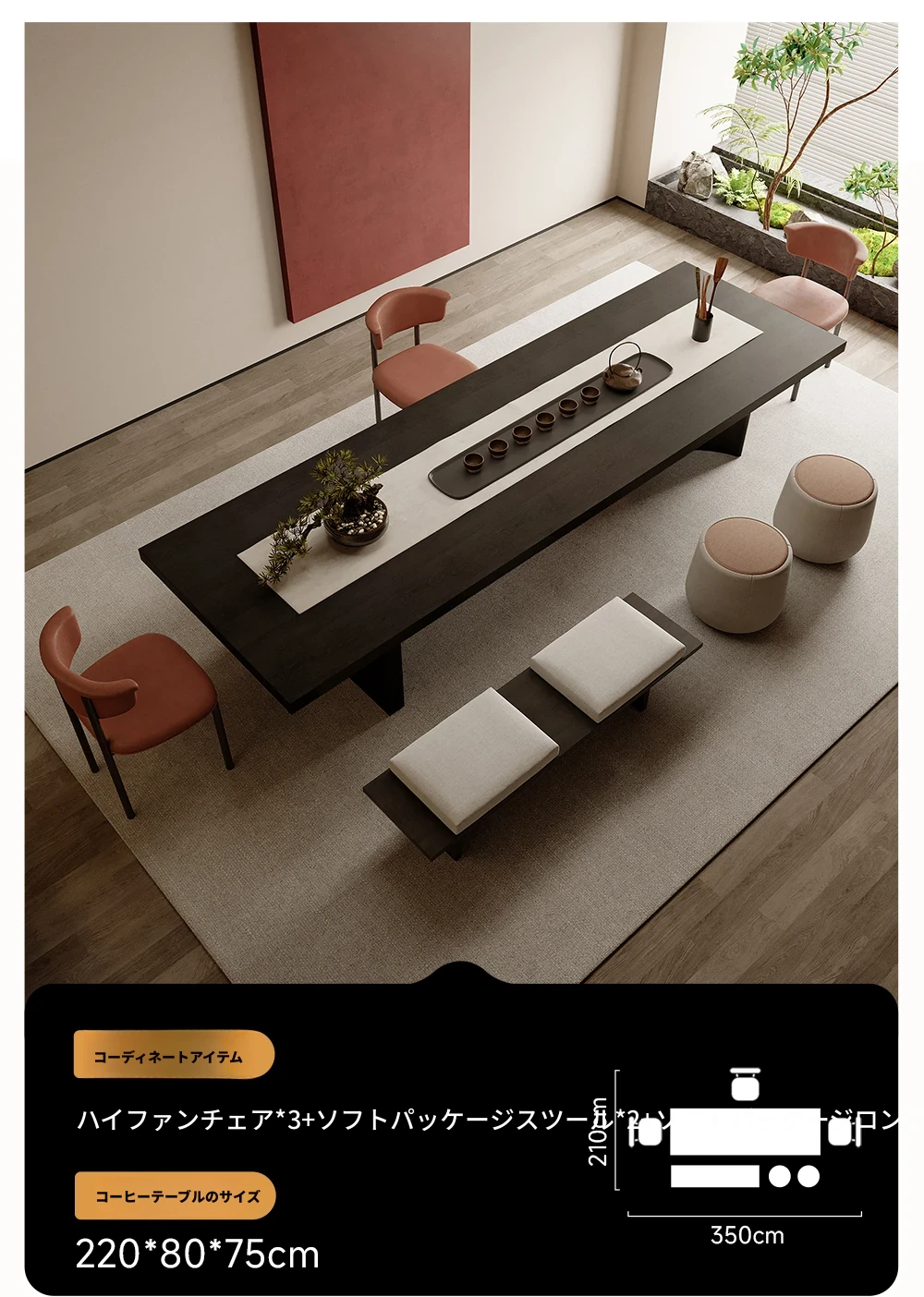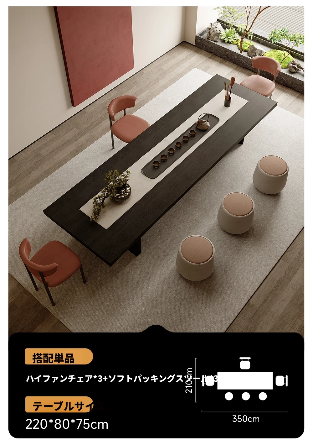 2.2メートル茶テーブル+ハイセイル椅子*3+ソフトパッキングスツール*2+1.2メートルベンチ