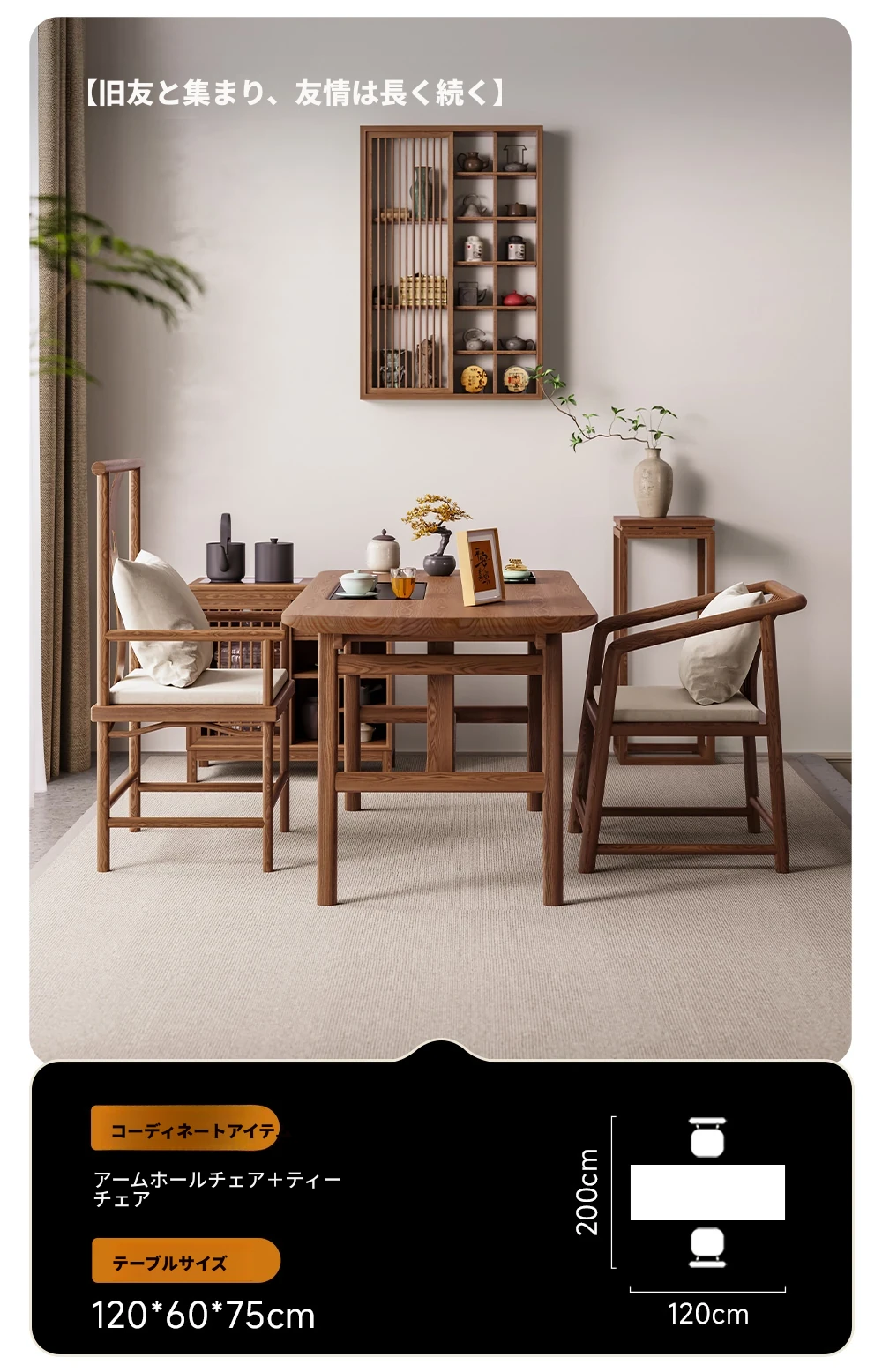 【人気商品】1.2メートル大葉松茶卓+アームレスト付き穴あき椅子+茶椅子