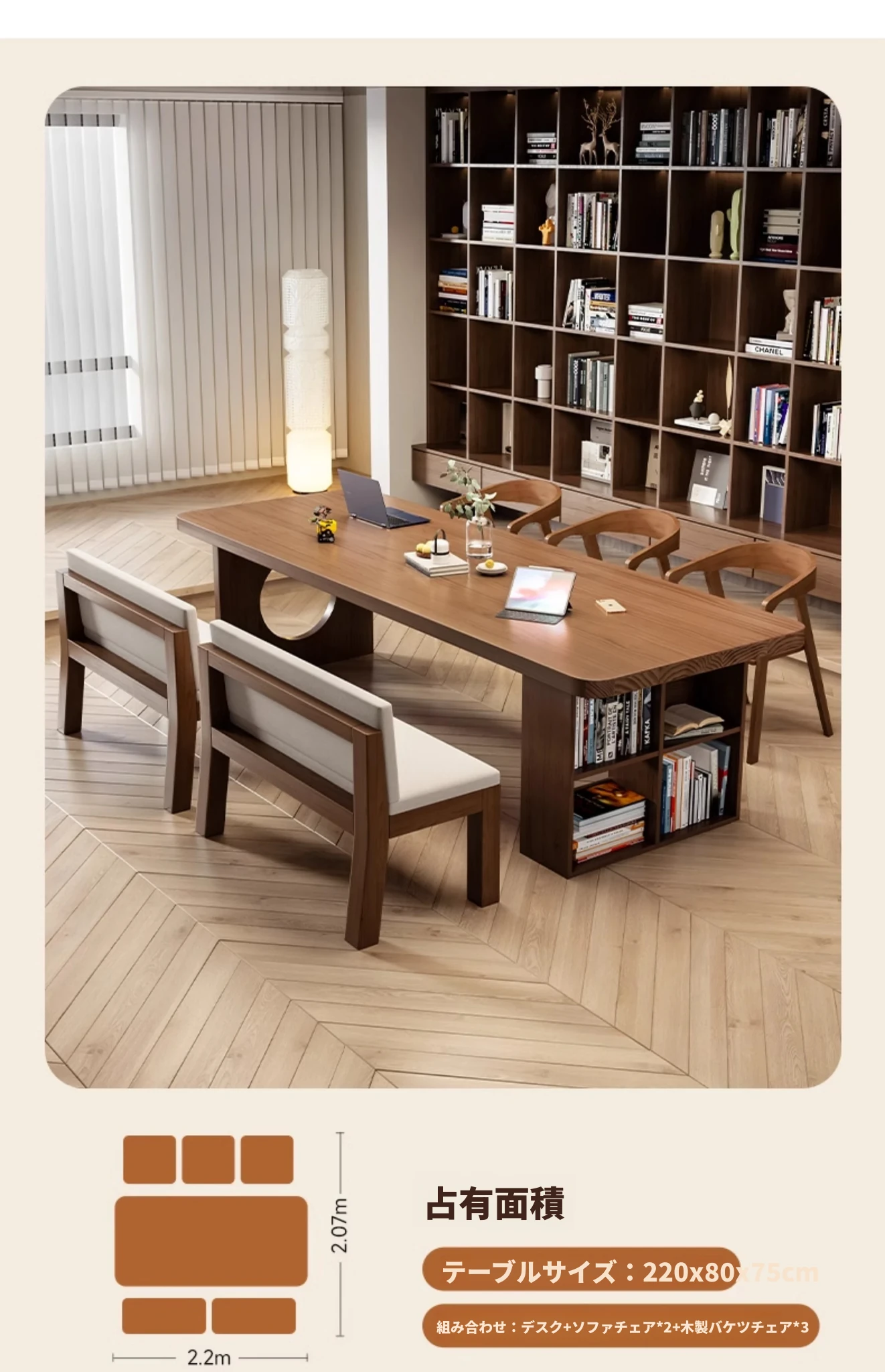 【快適な付き添いセット】2.0メートル5cmデスク+100cmソファ椅子*2+木製バケツ椅子*2