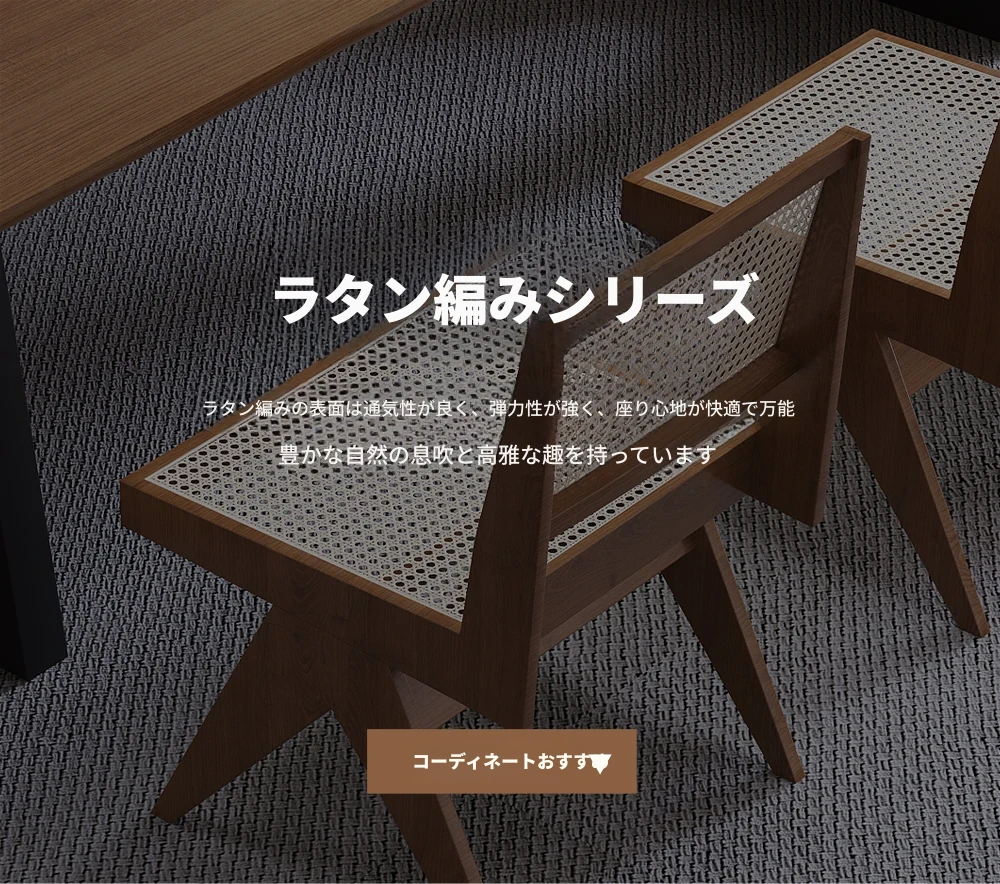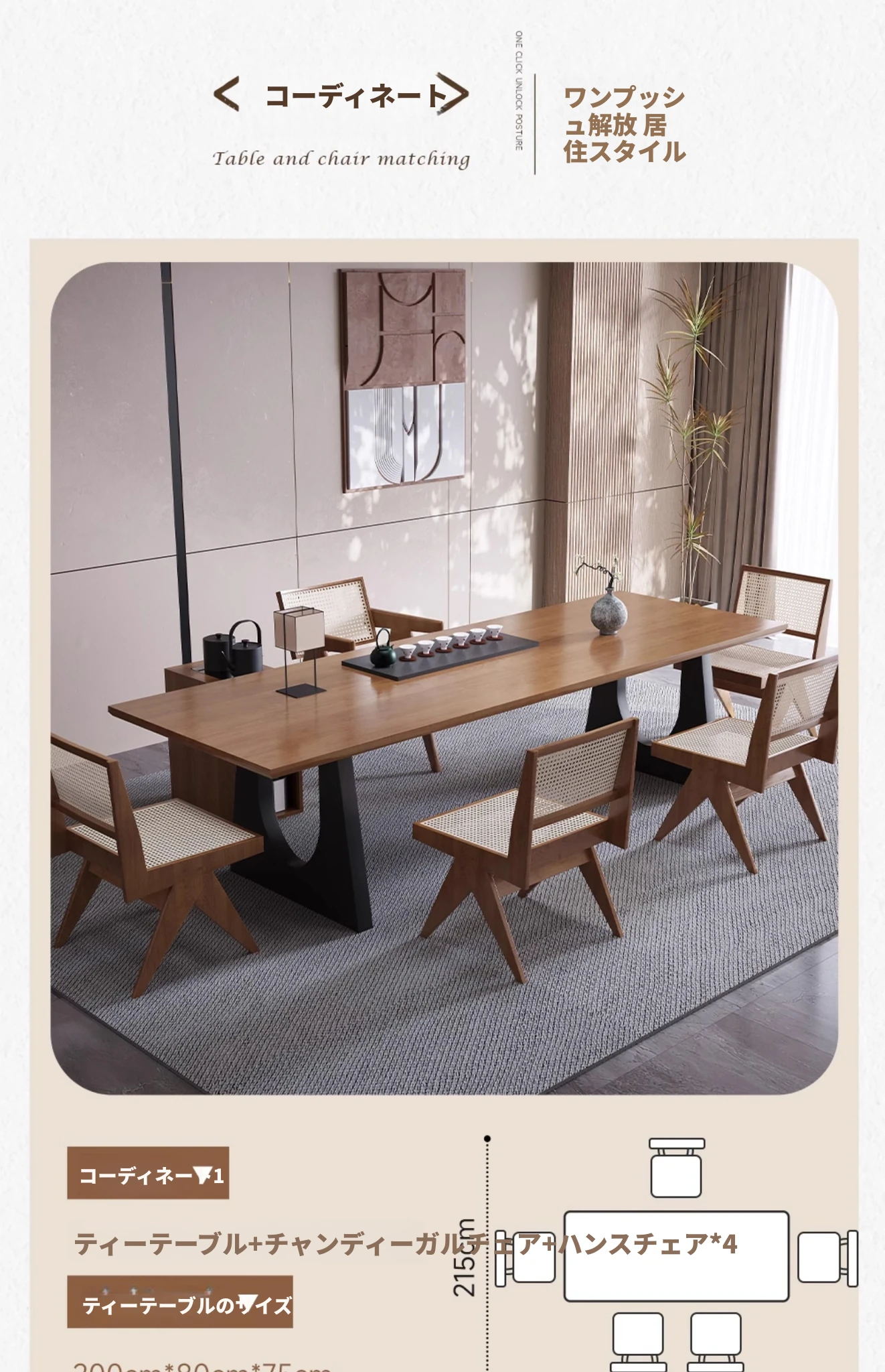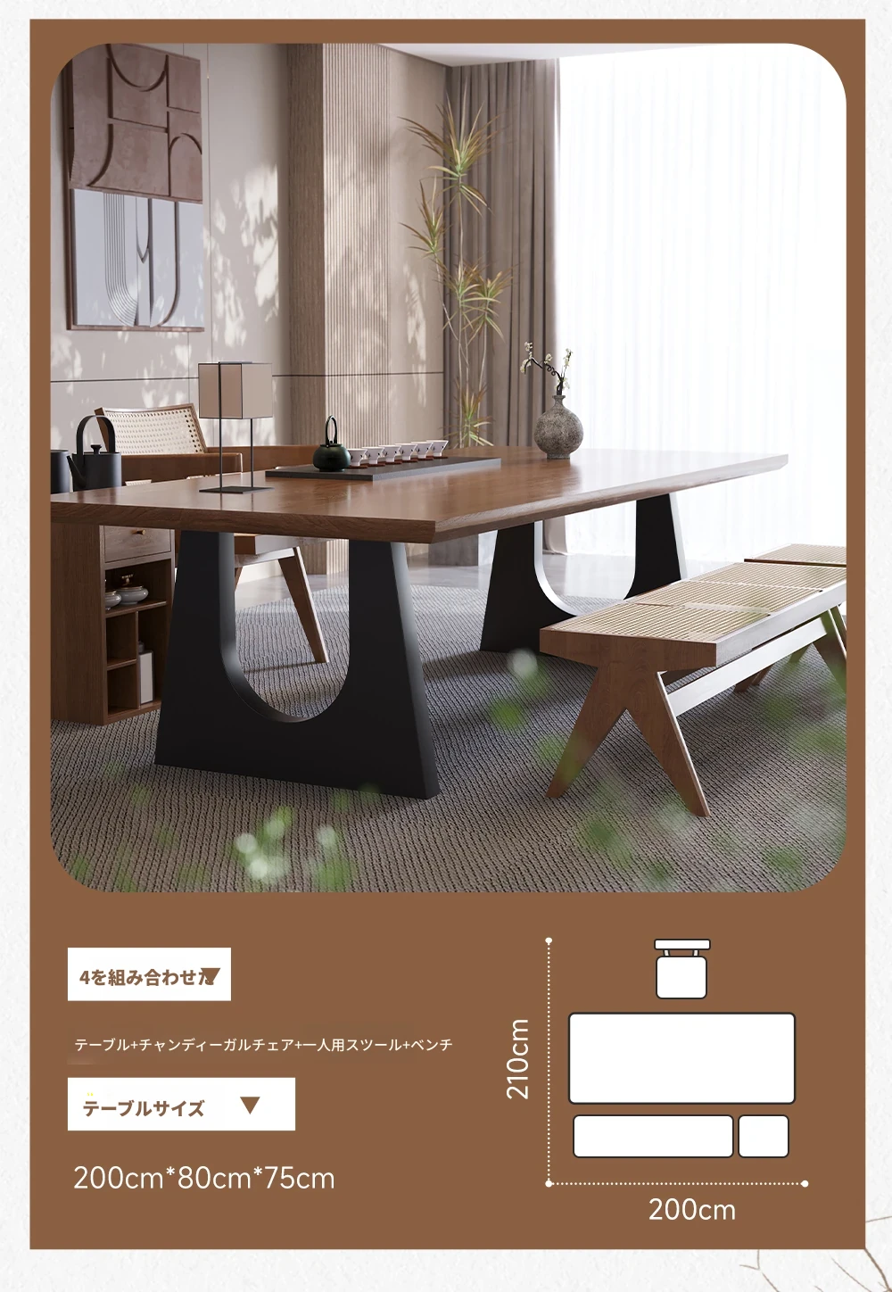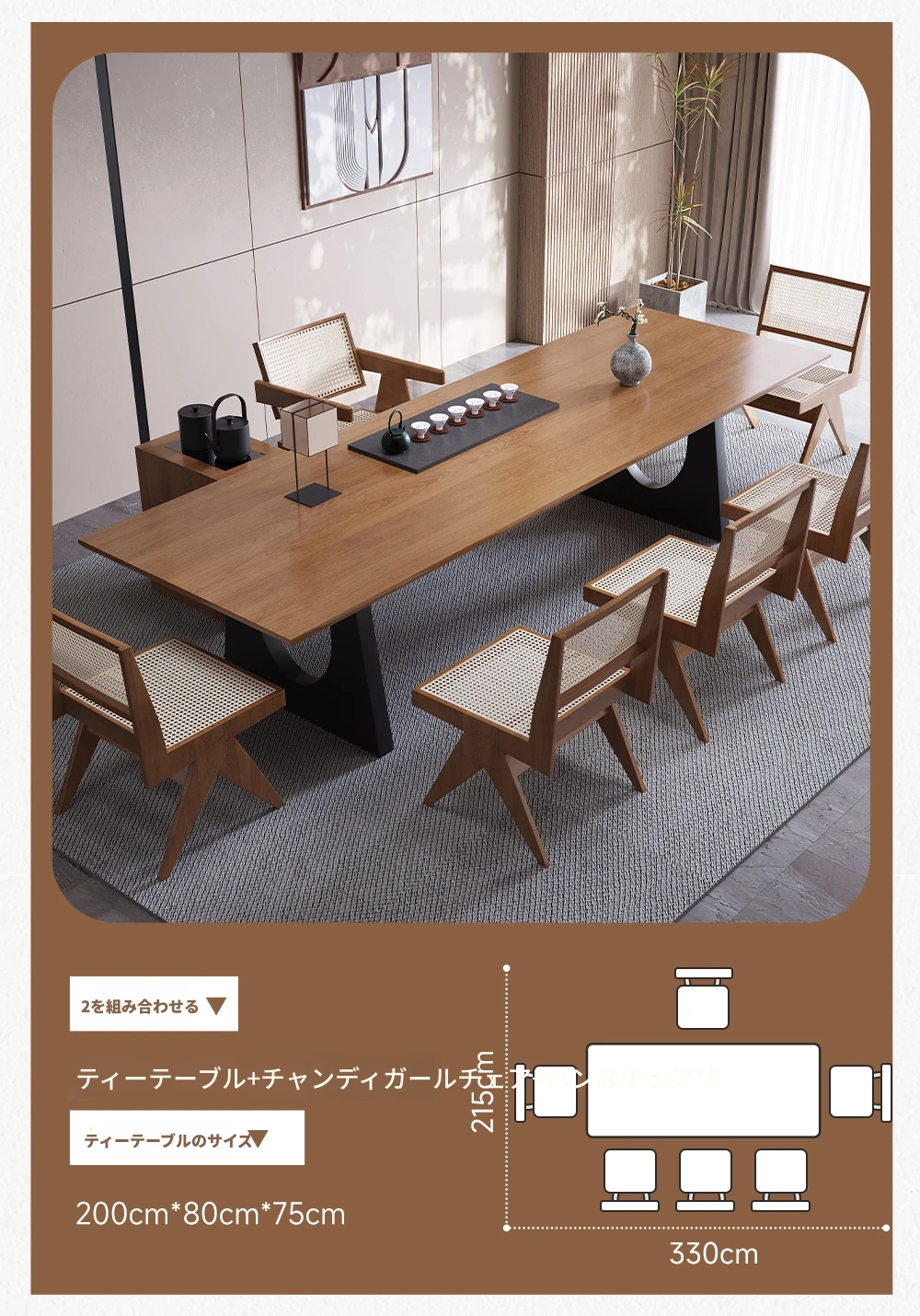 2.0メートル茶卓+チャンディガール椅子+ハンス椅子*4
