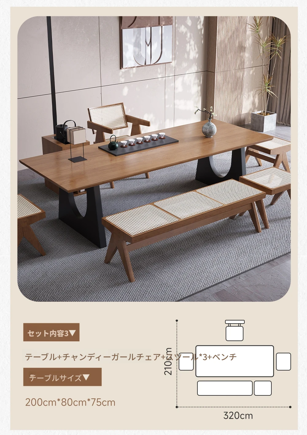 2.4メートル茶卓+チャンディガール椅子+一人用スツール*3+1.28メートル長椅子