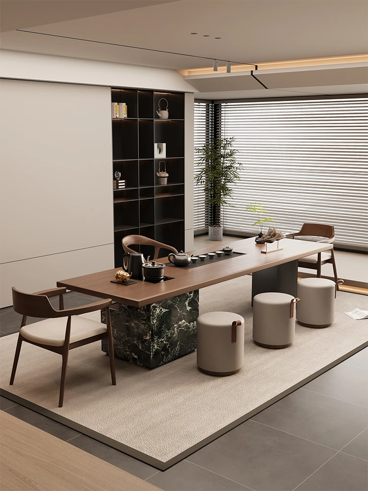 新中式デザインの南米ブラックウォールナット無垢材製の大板茶卓椅子セット - 自然の美しさを感じるオフィスでのリラックスタイムに最適な本格的な茶道具!